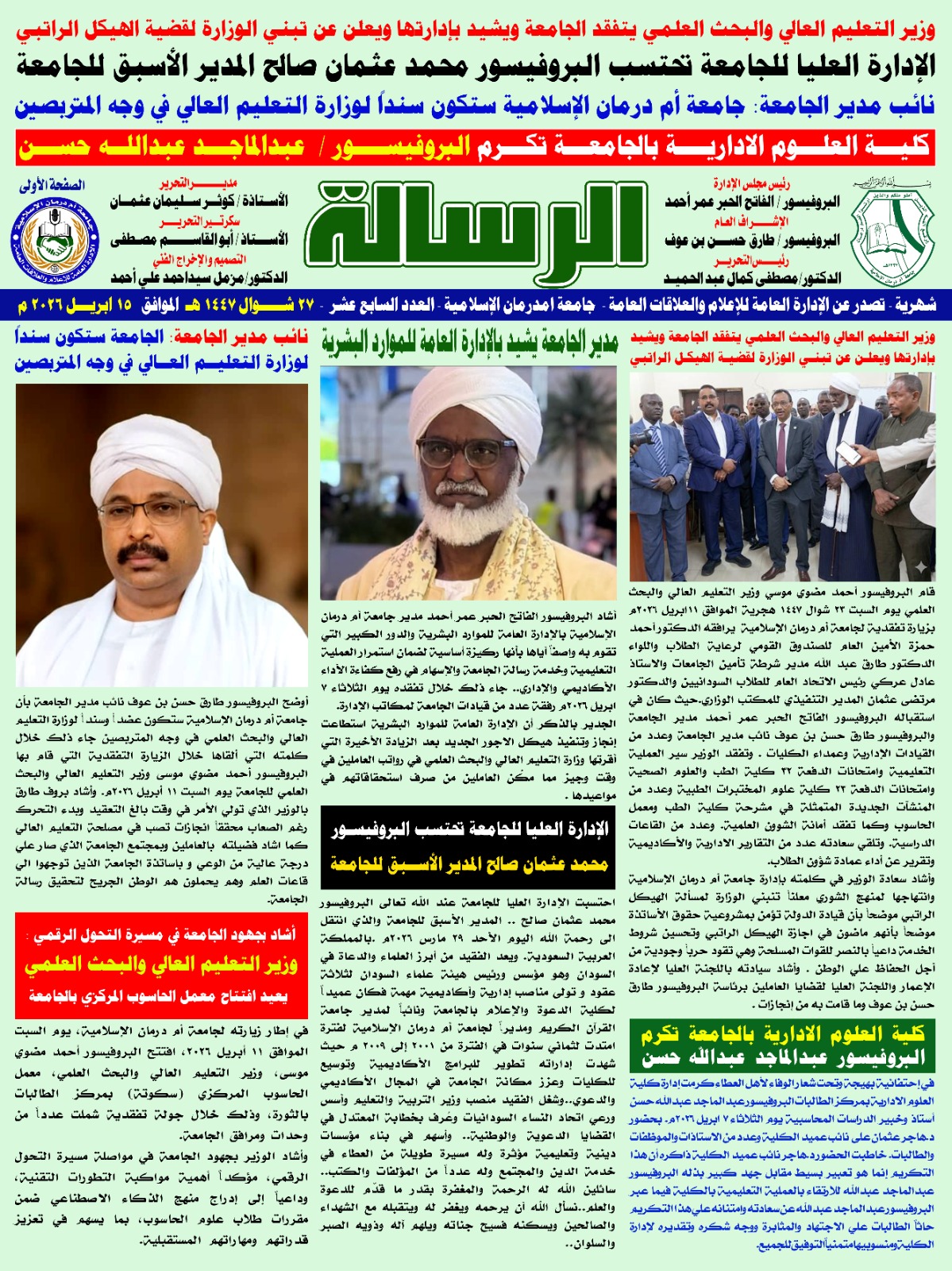 تم إصدار العدد السابع عشر من صحيفة الرسالة التي تصدر عن الإدارة العامة للإعلام والعلاقات العامة بجامعة أم درما